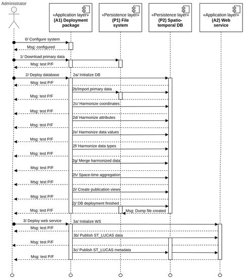 Figure 5 presents a UML sequential diagram in the deployment phase, which is the interaction between the main components of the application layer (deployment package and web service) and the persistence layer (file system and database system). The process starts with the configuration of the initial system, according to the administrator’s requirements. Next, the deployment package (A1) performs three major operations. Firstly, the LUCAS primary data distributed in the plain CSV format are automatically downloaded from the data provider specified in the system configuration. Secondly, after successfully downloading the primary CSV files to the server file system (P1), the database system (P2) is deployed. Deployment of the database system is split into ten sub-operations starting with a database initialization step and followed by importing the primary LUCAS data into the initialized database. The harmonization process includes the unification of spatial coordinates, attribute names, attribute data types, and data values. These operations are performed separately for each survey year. Subsequently, space–time aggregation of the harmonized LUCAS observations is applied. The deployment process is completed by creating a database dump file for the creation of the spatio-temporal database. Thirdly, the system web service (A2) component is deployed. Next, the harmonized LUCAS data in the database system may be published by the web service. Each of the sequential steps is followed by tests to evaluate the system performance.