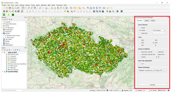 Another option for harmonized space–time LUCAS dataset exploration is to use the ST_LUCAS QGIS plugin. The plugin is a GUI integrated into the open-source QGIS platform. The user interface (Figure 7) is split into three tabs: (1) Download; (2) Analyze; and (3) Photos. The added value of using GIS is to interactively select the spatial, attribute, temporal, and thematic filters from the GUI (Download tab). In particular, it enables selection of an area of interest (spatial filter) by the extent of the map canvas, specification of a country from a list of EU countries or use of a user-defined vector polygon data layer. The plugin interface allows a list of selected years (temporal filter) and a group of attributes (thematic filter) to also be specified. There are five thematic groups in total to choose from, where each group contains specific thematic attributes in addition to the basic attributes. The following groups are available: Land Cover, Land Use; Land Cover, Land Use, Soil; Forestry; Copernicus; and Inspire PLCC (Appendix A Table A2). The user is also able to download LUCAS points with all available attributes.