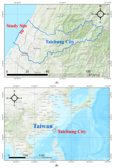 Study site (A) in Taichung, Taiwan (B) and onshore wind farms (C).