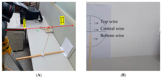The Canon EF24–70 mm F/2.8L II USM was used for the shoot. Table 1 presents the relationship between the camera’s focal length and its position (presented using the scale mark on GigaPan), which was determined according to the calibrated field displayed in Figure 4A. Because the calibrated field was located in an indoor space, the ISO, aperture size, and shutter speed were set at 800, F10, and 1/30, respectively. Table 1 reveals that the optimal scale mark value varied across focal lengths. Specifically, the optimal scale mark values for the 24, 35, and 70 mm focal lengths were 105, 100, and 80, respectively. If the camera was placed at a smaller scale mark value, the benchmark rod in the captured image would shift to the left in the clockwise rotation of GigaPan; if the camera was placed at a larger scale mark value, the benchmark rod in the image would shift to the right.