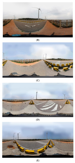 Figure 7 presents the locations at which the panoramas were captured. The shoot began at Station A and continued along the wind turbine boulevard to Station F for a total of six stations. The stitching quality obtained at each stop and the corresponding panoramas are presented in Table 4 and Figure 8, respectively. According to Table 4, Station A (Figure 8A) had the smallest RMSE standard deviation; that is, the stitching quality remained similar across the entire panorama compared with those of other stations; however, the average RMSE was higher than at other stations. Stations C and D (Figure 8C,D) had the lowest average RMSEs, indicating that their panoramas had the highest overall stitching quality among all stations. Moreover, the number of tie points was proportional to the stitching quality and inversely proportional to RMSE; therefore, increasing the number of tie points could effectively improve stitching quality. The number of tie points was also associated with the weather and the number of features on the subject at the shooting site. According to the RMSE classification of Autopano, all panoramas produced in this study were of high quality, and all of their RMSEs satisfied the basic requirement (less than five pixels) after manual correction.