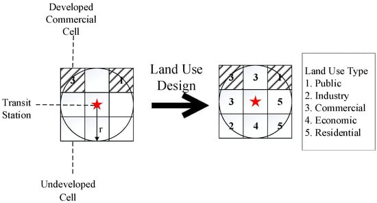 This paper presents a TOD planning method based on strategies appropriate to the Chinese context to solve the land use design problem. As depicted in Figure 1, considering the MRT station as the central point, the land use design problem aims to determine the type, density, and location of the surrounding undeveloped land use cells and to obtain an optimal land use layout based on the objectives relevant to TOD. Finally, alternative land use sketch maps are generated to display land use layouts [35,36]. Inspired by work by [14], seven types of land use are presented in this work, namely: public (e.g., school, government agency, hospital), industry (e.g., factory, warehouse), commercial (e.g., shopping mall, restaurant), economic (e.g., office building, corporate business, finance organization), residential (e.g., apartment, villa), road, and water. Notably, only the first five types of land use are applied to land use design because of the high cost of rectifying roads and water.