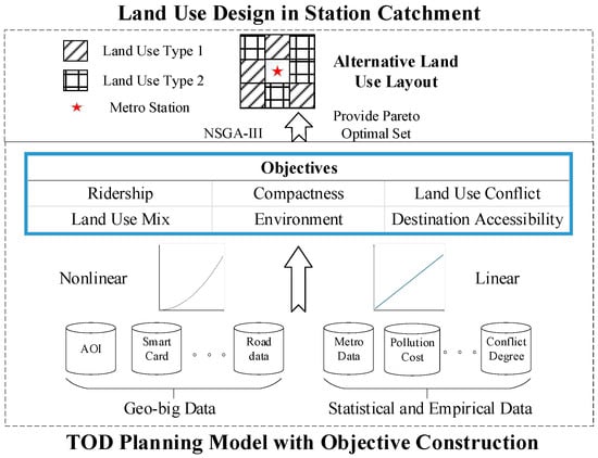 Numerous recent studies have focused on TOD planning and generated various effective strategies and methods within this topic [6,7,8]. Particularly, TOD planning with mathematical models is prominent in generating sustainable land use plans and an intuitive evaluation [9,10]. Quantitative TOD planning methods involve the significant branch of multiobjective optimization, which generates alternative land use schemes according to objectives based on TOD principles and strategies [11,12]. However, mathematical TOD models for China remain limited, although one noteworthy example of a TOD model for designing land use layout given a type and density around a metro station in China was proposed by Li et al. [13,14,15]. First, the parameters of the objectives mainly comprise coarse-grained statistical data and empirical indicators, which lead the objective functions to have insufficient expressive ability. Second, most objectives have been constructed with linear and straightforward functions, thereby simplifying the complicated relationship between objectives and land use, thereby reducing model reliability. Finally, although multiobjective problems have been solved in previous studies by weighting objectives, determining the relative weights is challenging because of uncertainty, and rarely have studies used actual multiobjective optimization in TOD planning. Fortunately, the appearance of urban geo-big data and the development of the learning model provide excellent potential for the refined construction and optimization of planning objectives.