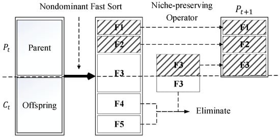 For each iteration of the reproduction, a set of candidates () consists of both the parent () and offspring () in the last iteration, and the purpose of preselection is to choose the best and most diverse individuals ( with the population size) for the next iteration. The procedure of the operator is shown in Figure 4, and there are two steps in the preselection.