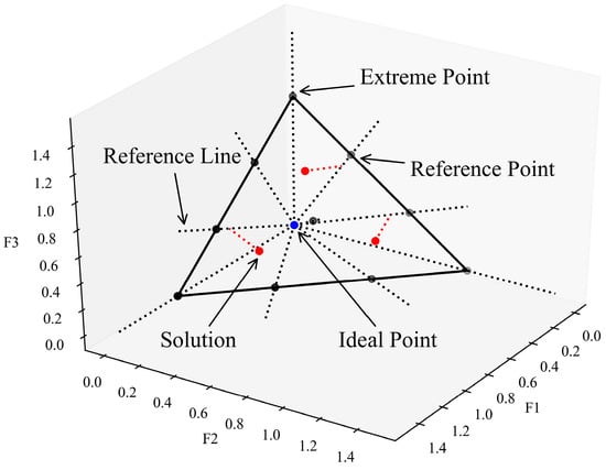 Niche-preserving operator: This operator is applied to choose individuals at the same level with the principle of individual diversity (such as F3 in Figure 4). The sketch map of the operator is shown in Figure 5. First, two-layer reference points (112) uniformly distributed on the unit simplex of the solution space are generated. Second, the ideal point is determined by the minimum value of each objective, and the extreme points are chosen as the points nearest to the axes. Third, the fitness of the objectives is normalized based on the ideal point and extreme point, and each solution is associated with the reference point whose reference line (the line that connects the reference point to the ideal point) is closest to the solution. Finally, when the reference point contains fewer solutions, the solutions associated with this reference point have a greater potential to be selected. Significantly, the reference point intrinsically represents the preference for objectives, which can be regarded as a novel “weight”, and the fitness with normalization displays a comparable “score” for all objectives, which helps further decision making.