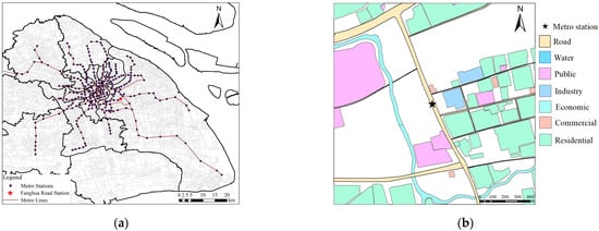 Map of the study area: (a) Distribution of the Shanghai Metro and Fanghua Road station; (b) Allocation of the land use around Fanghua Road Station.