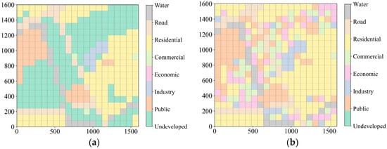 Land use sketch maps of initialization and optimization: (a) Initial land use maps of the station area; (b) Balanced optimized land use maps.