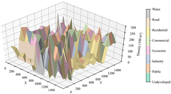 As discussed above, several consistencies and conflicts among the objectives need to be considered by decision-makers. Although the extreme optimal solutions achieve the best performance for each objective, a balanced solution is more favorable for practical planning. According to the “comprehensive plan and general land use plan of Pudong New Area, Shanghai” [55], the Fanghua Road Station of rail transit line 7 is regarded as the core, and the construction of both cultural parks and cultural facilities is planned to improve the comprehensive support of regional services and maintain ecological sustainability. Therefore, the percentage of public land use has to be set to a high value to satisfy this requirement, and the planning solution focuses more on land use conflict, land use mix, and pollution cost. Based on the purposes of the planning, an alternative balanced solution, which is selected from the aforementioned 105 alternative solutions, achieves the highest score of 0.455 after normalization and is associated with the reference point having the preference of (0.083333, 0.083333, 0.25, 0.25, 0.25, 0.083333) in each objective dimension. The solution for ridership is 58,616 persons per day, compactness is 1298, land use conflict is 4.742, land use mix is 0.256, pollution cost is 3.751 RMB per year, and total walking distance is 6.157 meters. Figure 7b shows the optimized land use sketch map and Figure 8 depicts the land use density of the selected solution around the station. Significantly, commercial land use is vigorously developed and mainly concentrated in the internal and intermediate areas of the station to attract the attention of residents. Economic land use is uniformly allocated in the planning area to offer plenty of employment. Residential land use is mainly aggregated in the periphery of the planning area, which is not influenced by the noisy station, and residents can walk home within a comfortable distance. Industrial land use is dispersed in the area with a small number of cells to maintain the land use mix and environmental protection. Finally, public land use including parks, cultural places, and public services, occupies a large space in the area, which is consistent with regional planning. The selected land use layout largely achieves the objectives of TOD planning and conforms to local political strategies [55], which provides suggestions regarding station-level land use development.