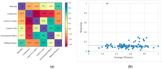 Relationships between the planning objectives: (a) Coefficient confusion matrix; (b) Relationship between the average walking distance and ridership.