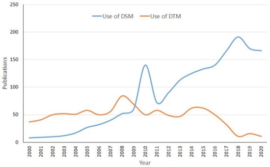 The use of GIS (geographical information systems) for visual basin analysis has been a widespread practice for almost 20 years [9]. Initially, these analyses were based mainly on digital elevation models (DEM), a specific type of digital terrain model (DTM). The use of models that included the visual “obstacles” of the territory (such as buildings, power lines, trees, etc.) was very scarce given their complexity and the inaccuracy of the data. However, the recent proliferation of digital models generated from LiDAR (light detection and ranging) data has led to the development of models based on the topographic level. In addition, they include the height of elements, such as vegetation and buildings. In practice, LIDAR data are obtained from laser pulses emitted and received by a scanner. The time difference between emission and reception allows researchers to calculate the distance of the objects and, thus, their height. This information creates a cloud with thousands of points from which the digital surface model (DSM) is calculated. The increasing use of DSM in the calculation of visual basins in scientific publications can be seen in Figure 1, which also show how the use of DSMs is increasing while the use of DTMs is decreasing, with a greater difference between the two types of models over time.