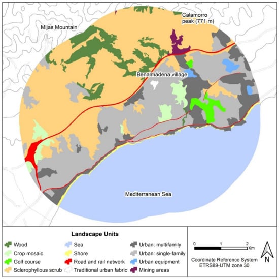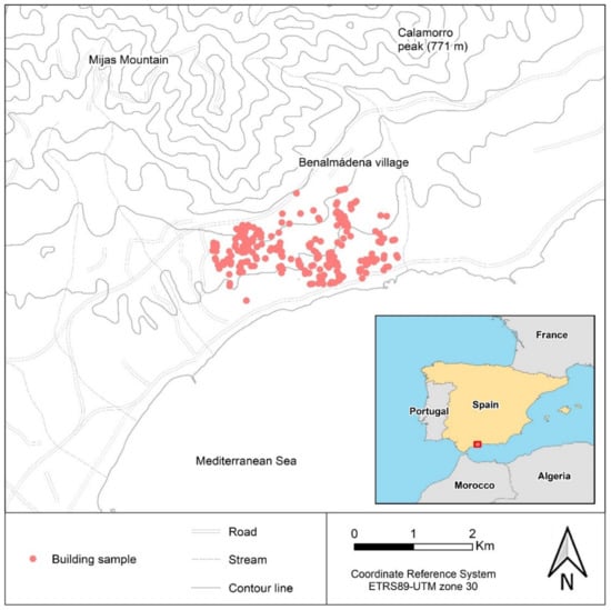 In general, the western coast of the province of Málaga is a highly urbanized area, due mainly to the development of tourism during the last half century, as well as to the recent metropolitan growth of Málaga City. As a result, Benalmádena has a considerable population size, with just over 67,000 inhabitants, distributed among the following several nuclei: the traditional (Benalmádena village) and the most recent nuclei of Benalmádena Costa and Arroyo de la Miel. Numerous single-family constructions, with a lower density, are extended among these nuclei, especially in the western part of the municipality. From an environmental point of view, the study area is located between a mountain range (Sierra de Mijas) and the sea. The mountains have step slopes due to their lithological composition (marble), reaching 1000 m above the sea level in just 4 km [52]. The urban development is located in the transition zone, between mountains and the sea. This area is arranged like a slipway, being formed of flimsier metamorphic materials, especially filites, and is configured as a succession of undulating hills, dissected by the hydrographic network, which descend towards the sea. The coastline, also rugged, is formed by cliffs with small coves between them. The arboreal vegetation is also relevant in the landscape. Paradoxically the density is low in the mountains, where the pine forest is dispersed. However, in the intermediate zone, the presence is higher, either along the river banks, or as vestiges of ancient tree crops and, especially, artificially introduced in plots and housing.