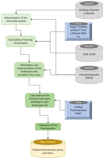 Additionally, the estimation of the value of the views is usually focused on the size of the visual basin, using digital surface models [7,8]. However, the value of the views should also consider the quality of the landscape, that is, the types of landscape within the visual basin. Therefore, it is necessary to have objective, systematic, and automatic methods that gather together all the variables related to the views (e.g., dimensions and composition) with the aim of providing greater precision to the delimitation of the visual basin and allowing its application to other study areas. This is especially important in urban and developable environments, where the analysis of the views is more complex due to the presence of natural and artificial elements that modify them. In this context, the main objectives of this paper are as follows: (a) to provide an automatic method for analyzing the quality of the views, including both their size and elements, and (b) to make advances in the estimation of the economic weight of views on real estate value.