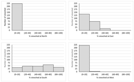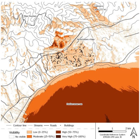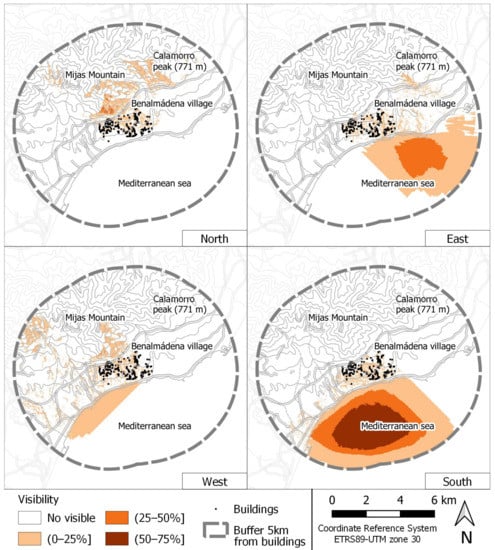 It can be seen how, together with certain points of great exposure to the north, the most common views are concentrated on the sea, to the south of the study area. To both the east and west, the visible land areas are much more dispersed. They vary between the study cases, and tend to coincide, again, towards the sea, which is most common in the south-facing views. Other points with some relevance can be observed to the north, although they are much more concrete and coincide with the highest areas of the Sierra de Mijas. Figure 7 shows the visibility of the study area towards all directions.