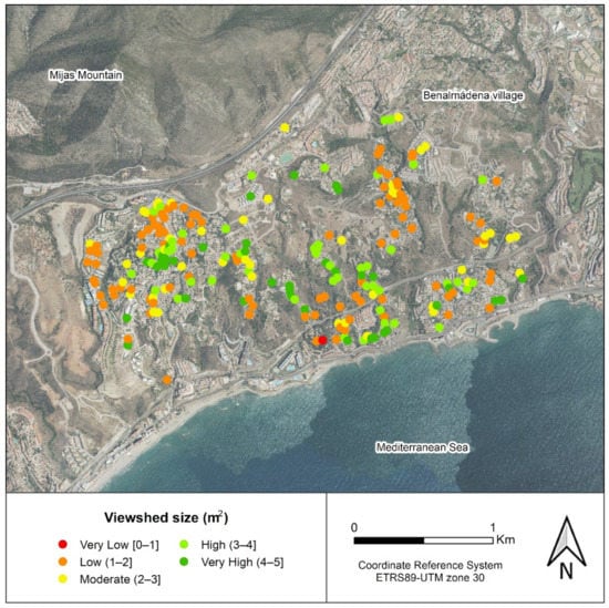 Although the vast majority of dwellings have a high position, the territorial layering towards the sea has determined that factors, such as the orography and the vegetation that delimits the boundaries of the plots, have influenced the results of the visual basins. As it can be interpreted in Figure 8, the main pattern behind the size of the visual basins is the topographic position of the dwelling. The topographic descent towards the sea is not homogeneous and is characterized by a succession of hills separated by small rivers and creeks. In this way, the dwellings located on the northern slope or in an intermediate zone between hills have smaller visual basins. This phenomenon is clearly observed in the western part of the study area, where a series of houses with visual basins lower than 270,000 m2 are adjacent to others at the southeast, with visual basins greater than 435,000 m2. Other explanatory factors are nearby higher buildings, or the presence of high vegetation used to delimit plots, which explain smaller visual basins, in red in Figure 8.