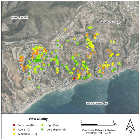 The distribution of the best views does not follow a clear spatial pattern, although it delimits areas where the highest quality views predominate. As an example, there is a clear division between the slopes of a hill in the western part. The score at the northwest slope ranges between 1 and 2.5, given that a recurring element of its views is the Mediterranean scrub, with moderate–low aesthetic appeal. On the other hand, the southeast slope, with a better orientation to the sea, includes numerous points with the highest quality views.