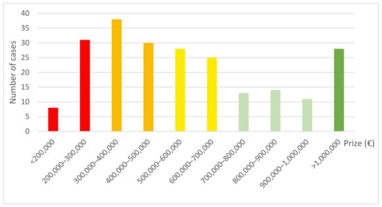 The average price of the 226 dwellings analyzed is 624,747.65 €. This is a high value in the context of the Spanish real estate market, which is mainly explained by the touristic character of the area and the attraction generated by the proximity to the sea. However, as can be seen in Figure 11, the sample is heterogeneous, with a huge price variability. Indeed, the standard deviation is 440,279.33 €, and the coefficient of variation is 70.47%.