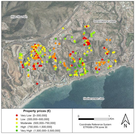 It must also be emphasized that the real estate offer in the selected zone is fairly homogeneous. It oscillates between a medium-high and a high level. The infrastructure role is relatively small, since the range of services and communications is homogeneous, avoiding the spatial fragmentation. In this way, the main factors involved in the price are mainly those intrinsic to the dwelling itself (e.g., size, quality of construction, gardens, and facilities, such as swimming pools), along with others, such as accessibility, the social prestige, or the quality of the environment.
