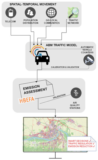 To create quality decision-making tools that would contribute to transport sustainability, we need to build models relying on accurate, timely, and sufficiently disaggregated data. In spite of today’s ubiquity of big data, practical applications are still limited and have not reached technology readiness. Among them, passively generated telecom data are promising for studying travel-pattern generation. The objective of this study is twofold. First, to demonstrate how telecom data can be fused with other data sources and used to feed up a traffic model. Second, to simulate traffic using an agent-based approach and assess the emission produced by the model’s scenario. Taking Novi Sad as a case study, we simulated the traffic composition at 1-s resolution using the GAMA platform and calculated its emission at 1-h resolution. We used telecom data together with population and GIS data to calculate spatial-temporal movement and imported it to the ABM. Traffic flow was calibrated and validated with data from automatic vehicle counters, while air quality data was used to validate emissions. The results demonstrate the value of using diverse data sets for the creation of decision-making tools. We believe that this study is a positive endeavor toward combining big data and ABM in urban studies.