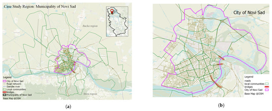 Case study area. (a) The municipality of Novi Sad is shown with its local communities. In the Figure, the city of Novi Sad (marked with pink polygon) can be distinguished from suburban areas which were included with its main roads to model traffic pressure in the city. (b) The city of Novi Sad, shown with its local communities and existing bridges.