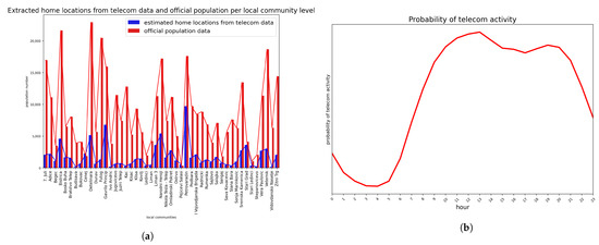 Telecom output. (a) The number of origin (home) locations extracted from telecom data compared to census data at local community level. (b) Extracted probability of temporal telecom activity across hours in a working day for the whole population.