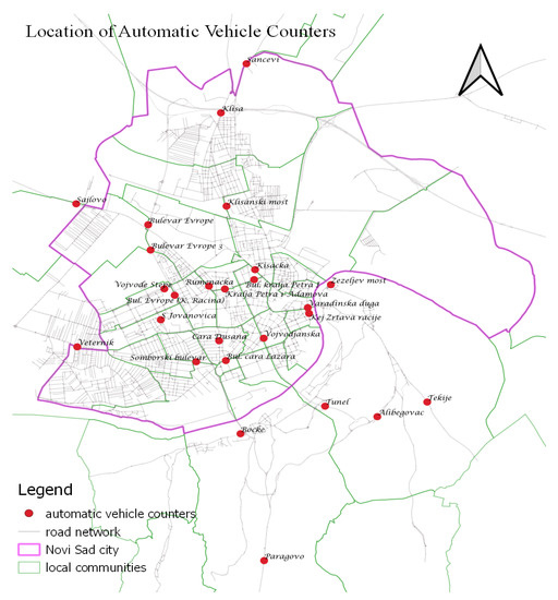The data set from automatic vehicle counters was available for the time periods 1–17 November 2019 and 3–9 December 2019. It contained the number of cars at 1-h resolution from 26 counters, and the average speed from 16 counters located at main crossings in the city (Figure 4). However, as implementing those was a pilot project in the case study, some interruptions in data collection were present, and thus we first cleaned the data. Moreover, interruptions and inconsistent data were more present when measuring speed, compared to counting the number of vehicles.