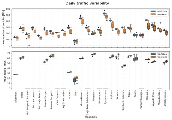 We eliminated counters with invalid records. We set a condition that a counter must have at least four records when counting the cars or measuring the speed in one day (4 h) to be kept for validation or calibration. The number four was chosen for the possibility of calculating the correlations. If during a day, most of the counters had an interruption in the data collection, we wiped it out. In addition, we eliminated days that we identified as extreme outliers, as we assumed that there was an error in data collection. Finally, we ended up with 7–17 counters per day (depending on the day and measure (number of cars or average speed); measures from different counters were available) and 16 usable days. We calculated the mean number of cars and their average speed on a daily basis for the usable days and available stations and showed their variability in Figure 5.
