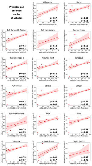 Validation—Pearson’s (p) and Spearman’s (s) correlation coefficients between predicted and observed number of cars in automatic vehicle counters data set. The selected day from automatic vehicle counters data set was 3 December 2019. Please note: the axes are not in the same scale to emphasize the captured trend.