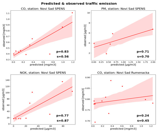 Validation—Pearson (p) and Spearman (s) correlation coefficients between predicted and observed emission in air quality stations. The selected day—6 November 2019 Please note: there were interruptions in measurements of at the Novi Sad Spens station. Moreover, the axes are not in the same scale to emphasize the captured trend.