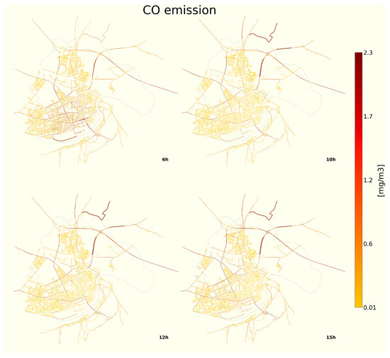 We simplified the emission assessment since we did not have precise data on vehicle types or engines or factors assessed for Serbia. We chose to use factors estimated for Austria, as it is geographically the closest country. We used aggregated values provided for passenger cars and calculated emissions of pollutants and at 1-h resolution. We applied Formula (1) to calculate the emissions per traffic link. As reported in the literature mentioning that coefficients are approximately twice as large when the traffic is in a stop&go regime [62], we added the k coefficient to illustrate that. For every road link on which the assessed speed was <, value was set to be 2, otherwise 1.
