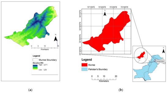The Tehsil Murree is one of the renowned hill stations of the Rawalpindi district with coordinates of 33.9078 N and 73.3915 E at an elevation of about 7500 feet. The Digital Elevation Model (DEM) of the study area was used to determine the elevation required at any given location. Figure 1a shows the DEM of the study region, whereas Figure 1b shows the study area’s location.