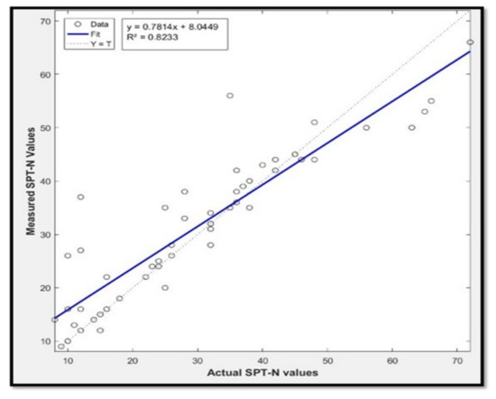 The accuracy of interpolated N value maps was determined by 52 points obtained from field investigations which were compared with predicted SPT N values at the same point in the study area. These additional 52 points were not used in the generation of SPT N value maps. Figure 5 depicts a statistical comparison of created and measured cell values. Regression analysis was done in which the R2 coefficient of determination was calculated. The acquired results by regression analysis demonstrated that the kriging approach maps the geotechnical parameters, and that these values were comparable to the original data. The coefficient of determination (R2) was 0.8233. The coefficient of correlation being greater than 0.8 indicated a strong correlation between the two variables [31].