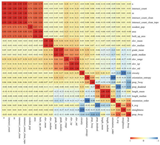 The point dataset has 33 indicators in total, including 25 indicators that describe various forms of each street network. Some indicators may be strongly correlated. For instance, the indicator straightness is an inverse of the circuity (Table 2). This indicates that the spatial patterns of using some indicators are similar or even the same. The purpose of the correlation analysis was to investigate: (1) whether any of the 25 indicators were highly correlated and (2) which of them were highly correlated.
