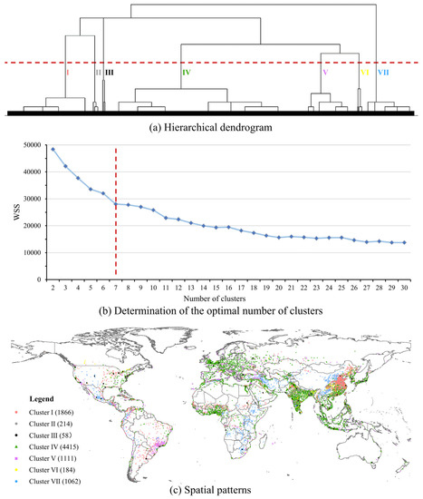 The 8910 urban street networks can be grouped into seven clusters (Figure 2a–c), colored red (Cluster I), gray (Cluster II), black (Cluster III), green (Cluster IV), purple (Cluster V), yellow (Cluster VI) and blue (Cluster VII). Figure 2c shows that 70% ((1866 + 4415)/8910 = 70.5%) of cities are clustered as either Cluster I or Cluster IV, and almost 50% (4415/8910 = 49.6%) of cities are clustered as Cluster IV.