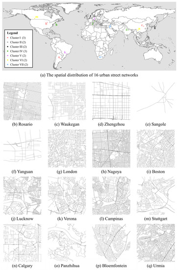 The detailed view of 16 typical urban street networks (each was visualized in a 5 km × 5 km grid).
