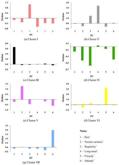The 8910 urban street networks were further clustered based on the six PCs in Table 3. The hierarchical clustering method was implemented in the data mining software IBM SPSS Statistics (version 22), after which step, seven clusters were identified and their spatial patterns were visualized in the geographic information system software ArcGIS (version 10.6) [38]. Both the hierarchical diagram and the spatial patterns of these clusters are shown in Figure 2.