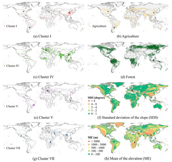 Comparison of the spatial patterns of the four typical clusters, i.e., (a) Cluster I, (c) Cluster IV, (e) Cluster V and (g) Cluster VII, with those of the four geographical factors, i.e., (b) agriculture, (d) forest, (f) standard deviation of the slope and (h) mean of the elevation.
