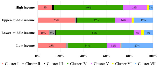 Furthermore, the clustering results may also be used to investigate the relation between street network forms and socio-economic developments. As an example, we divided the 8910 cities into four income groups: high income, upper-middle income, lower-middle income and low income. To be specific, all the cities of a country were divided into the same group according to the classification of World Bank (available online: https://datahelpdesk.worldbank.org/knowledgebase/articles/906519-world-bank-country-and-lending-groups (accessed on 1 June 2022)). For each group, we calculated the proportion of cities in terms of each cluster (Figure 6). Figure 6 shows that in the high-income group, there is a relatively higher percentage of large-size cities (Cluster III) than that in the low-income group, but there is a relatively lower percentage of cities with long street segments (Cluster II) and at a high altitude (Cluster VII) than that in the lower-middle- and low-income groups. Thus, the difference in street network forms may have implications for socio-economic developments. More importantly, the finding may also be interesting to planners and local officers because the street networks of some lower-middle- and/or low-income countries may be improved (e.g., by increasing street network density) to promote socio-economic developments.