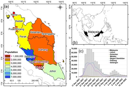 (a) The population for each state in Peninsular Malaysia; (b) location of Malaysia in South East Asia; (c) the number of victims evacuated during the flood event.