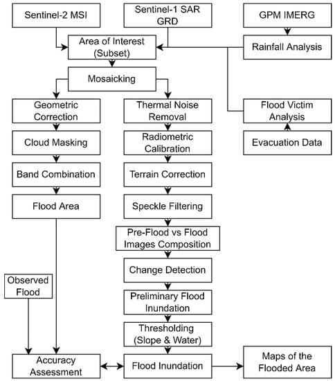 The pre-processing of the Sentinel-1 and -2 datasets included the geometric and radiometric corrections. The Sentinel-1 GRD dataset was retrieved from the GEE platform via instrument mode and received polarization VH, where the date range was set on the driest month of the state for the before-flood period, and the flood dates as stated in Table 1 for the during-flood period.