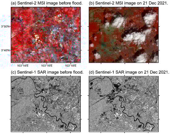 Before- and during-flood satellite images captured by (a,b) Sentinel-2 MSI and (c,d) Sentinel-1 SAR in Kuantan city, Pahang.