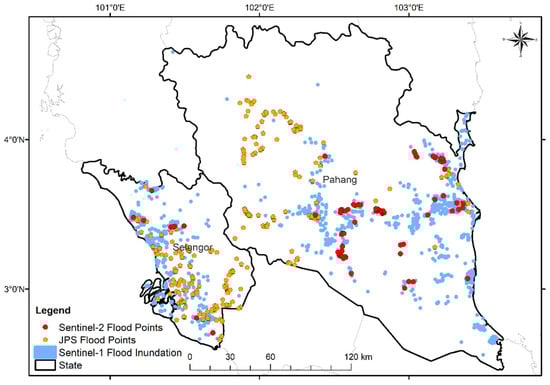 Unfortunately, due to the limited availability of the Sentinel-2 image during the period, the flooded area points were only managed to be collected for the Pahang and Selangor states. A total of 75 points were collected from the Sentinel-2 image based on the random sampling method on the flooded surfaces. Besides the flood location collected from the Sentinel-2 optical data, we also utilized the observed flood data collected by the National Flood Forecasting and Warning Center (PRABN), DID. The locations where flooding occurred during the 2021–2022 flood event, mostly in the residential areas, were used for the validation purpose. The observed flood data were collected by DID officers on-site when the flood receded. The data provided by PRABN was then filtered to select only the data that had the common record time as the Sentinel images, whereas in this study, a total of 275 matched flood records were adopted for the validation purpose over the Pahang (142 points) and Selangor (133 points) states. Therefore, a total of 350 points (75 points from Sentinel-2 and 275 points from site visits) were used in validating the Sentinel-1 SAR flood inundation maps as shown in Figure 4.