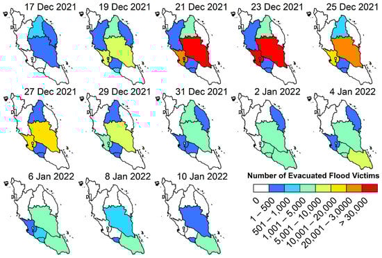 According to the flood victim evacuation reported by NADMA [], the victims started to be evacuated to the relief centers beginning on 17 December 2021 (Figure 5). The spatial distribution of the evacuated flood victims shows the victims evacuated in Pahang increased drastically from less than 500 on 17 December 2021 to more than 30,000 people on 23 December 2021. Meanwhile, the number of evacuees in Selangor also rose from less than 10,000 people on 19 December 2021 to more than 30,000 people on 23 December 2021 due to the subsiding floods []. Based on the flood report, there were a total of 685 temporary relief centers set up across Peninsular Malaysia during the flood event, with the most in Pahang (382 centers). In Malaysia, the flood victim relief centers were managed by the Department of Social Welfare []. The relocation of the victims to the relief centers was organized by governmental and non-governmental agencies, based on the conditional analysis performed by the authorities according to the physical factors, i.e., current water level, number of victims for each relief center, and capacity and quantity of the aid and materials that could be supplied.