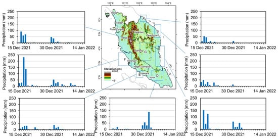 The past precipitation trend and precipitation-related extremes on the east coast of Peninsular Malaysia (Pahang, Terengganu and Kelantan) were studied by Mayowa et al. [] and revealed that there is an increasing trend of the precipitation and precipitation-related extremes in the region over the past 40 years (1971 to 2010). In Pahang (refer to plots C and G), the current study period shows that the intensified precipitation began on 15 December 2021, with the coastal part of Pahang having 50 mm higher daily precipitation (plot C) than the central part of Pahang (plot G). Another notable precipitation sprout in Pahang was on 30 December 2021. This event caused another wave of floods in the state due to the overflowing water levels in the Lipis River and Serting River in central Pahang [].