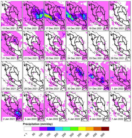 Basically, IMERG data can be divided into Early Run, Late Run and Final products, which are available ~4 h, ~12 h and ~2 months after capturing the earth surface. The IMERG Late Run product downloaded from the NASA Giovanni online tool (https://giovanni.gsfc.nasa.gov/giovanni/ (accessed on 11 January 2022)) was used to analyze the spatio-temporal changes of the daily precipitation for Peninsular Malaysia from 15 December 2021 to 7 January 2022. The quality of the IMERG Late Run product is slighter better than the Early Run version due to the calibration scheme in the algorithm; therefore, it is more appropriate for the flood precipitation analysis. This precipitation analysis is conducted to identify the amount of the daily precipitation that has led to the flood in each state of Peninsular Malaysia. IMERG-Late was used to study the spatial and temporal changes of daily precipitation over Malaysia from 17 December 2021 to 10 January 2022 as the explanatory variable to further illustrate the relationship between the climate-induced surface water and flooding extent [].