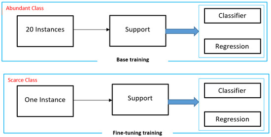 The fundamental features of the abundant class represent the common features of both the abundant and new class. Therefore, the basic features of the moving objects have multiple resemblances. For instance, a horse has four tube-shaped legs, as do the new classes of cows and dogs, and so few-frames training resembles a transfer learning concept. For more perception, our model needs two-phase training comprising abundant training with a large dataset that does not have the new class, followed by scarce training which is tuned according to the new class.