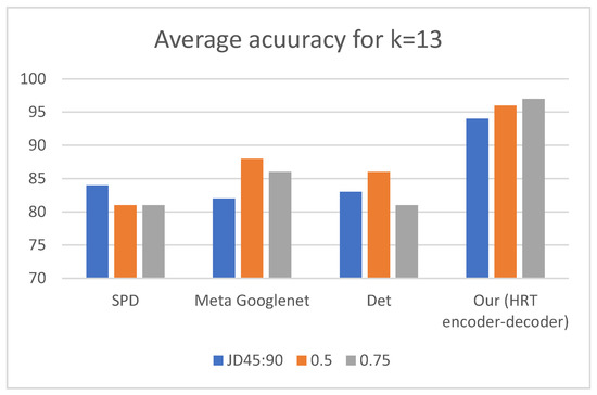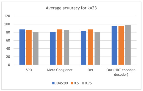 Compared with the DOC19 dataset, DS17 show more complications in moving object tracking processes due to the DS17 set having more video frames. We performed the training of the model with 60 abundant classes of DS17, and then we performed the fine-tuning process of the model when the frames were 13 or 23, separately. The results are depicted in Table 2. Our proposed model outperforms previous models. When the frame number was 13, our model enhanced the performance by 8.1% at JD45: 90, and for a frame number of 23, our model enhanced the performance by 9.3% at JD45: 90. The results are illustrated in Figure 4 and Figure 5.