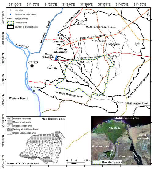 Spatial urban expansions pose potential impacts to many aspects of watersheds, including water quality degradation [,], soil degradation [,,,], and local climate changes [,,,]. These potential impacts also include drastic changes in the ecological settings of watersheds [,,,]. In addition, the magnitude of surface runoff and total discharge within watersheds significantly increases in response to spatial urban expansion [,,]. These hydrologic alterations can be strongly attributed to reducing the soil infiltration capacity within watersheds because increasing impervious urban layers results in an eventual high runoff coefficient []. These changes in hydrologic characteristics could explicitly expose urban areas within watersheds to water-related hazards [,,]. Enormous changes could take place in stream networks and topographic characteristics under spatial urban expansion through watersheds []. The previous effects of spatial urban expansion through watersheds are highly expected to occur in the area east of Cairo. Nevertheless, limited studies have been carried out on the magnitudes, directions, and rates of spatial urban expansion in the area east of Cairo (e.g., [,]) and on the influence of these urban expansions against the morphologic, hydrologic, ecologic, and topographic characteristics of these watersheds (e.g., [,]). Therefore, it is vital that the magnitudes, rates, and directions of spatial urban expansion in the area east of Cairo and their interactions through watersheds be studied using efficient monitoring and analytical techniques, such as remote sensing and GIS.