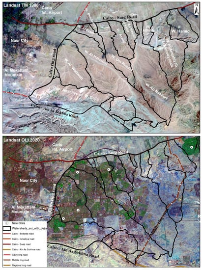 The spatial urban expansion east of Cairo was initiated after the establishment of the CRR in 1986. The landscape of the study area has entirely changed during the 34 years extending from 1986 to 2020 (Figure 2). The 1986 Landsat image shows that the study area was a barren land with primarily well-developed surface stream networks (Figure 2). These networks were organized to form the fundamental landscape morphologic units in the study area comprised of arid watersheds (Figure 2). These watersheds had different directions, shapes, spatial extents, and topographies. For instance, the principal orientations of these watersheds were north–south, northwest–southeast, and northeast–southwest (Figure 2).