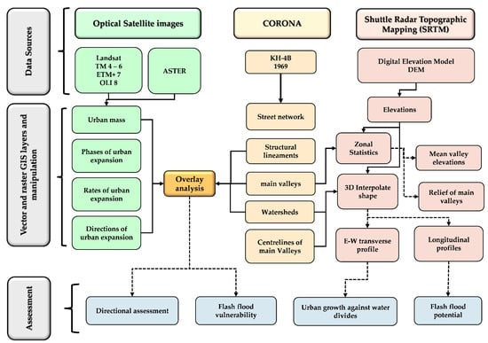 Throughout the study area, numerous numbers of stream branches conjoin the main valleys of watersheds. These stream branches discharge the adjacent hillslopes, which are characterized by different geospatial orientations rather than having dip slope and scarp slope sides, of tilted strata. Clearly, the study area has a complex morphologic setting inherited from a complex history of interaction between the tectonic and erosional forces. This interaction has produced salient morphologic landforms, such as watersheds, stream networks, and hillslopes. In this context, these hillslopes could be considered the principal land blocks or rock blocks for possible planning of spatial urban expansion. The principal concern is whether the massive spatial urban expansions have considered the morphologic setting of the study area. This research aims principally to test this hypothesis by studying the magnitudes, rates, and directions of spatial urban expansions and their spatial relationships with the geospatial orientations of the watersheds and their potentials for developing flash floods.