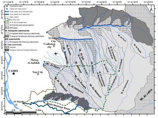 Regional morphologic and geospatial setting of the major drainage basins and their sub-watersheds in East Cairo.